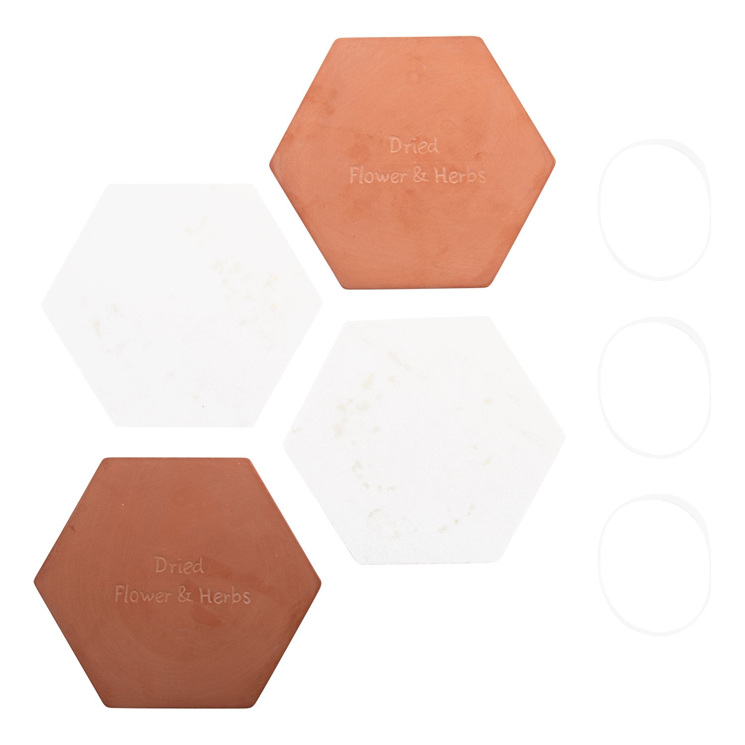 - Le set se compose de 2 disques en terracotta, 2 couches de feutre et 3 bandes en silicone