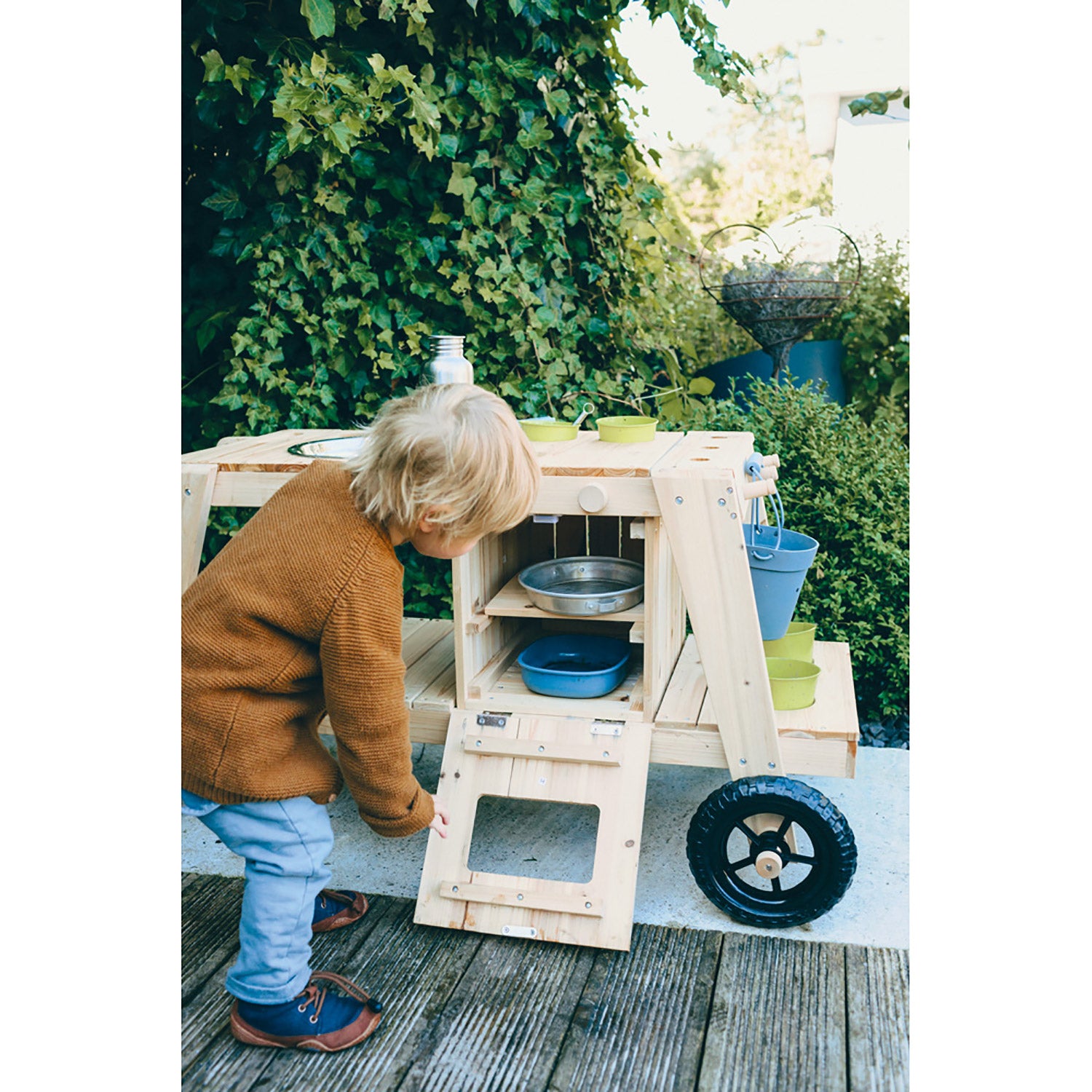 Ses roues indestructibles sont uniques : les enfants peuvent ainsi la déplacer autant qu’ils le souhaitent. Un four avec deux boutons produisant des sons de clic, un grand bac à boue, deux petits pots à boue et deux pots de fleurs en métal, ainsi que des découpes, des crochets et une surface de rangement pour organiser les outils de jardinage, les ustensiles de cuisine et les accessoires de boue complètent cette extraordinaire « cuisine d’été » !
