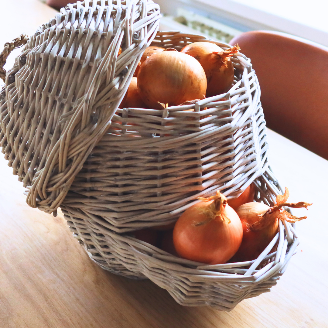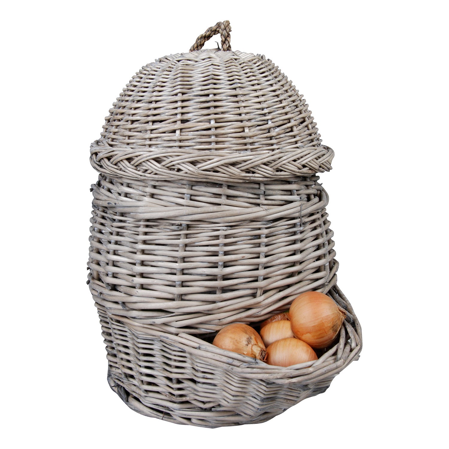 Avec ce panier authentique et décoratif, les oignons peuvent être conservés idéalement dans la cuisine, le cellier ou la cave, avec peu de risque de germination. Grâce à sa structure ouverte, la récolte est bien ventilée et reste fraîche plus longtemps. Grâce à sa grande ouverture, c’est toujours le stock le plus ancien qui sort du panier en premier. Il convient de placer la récolte fraîche dans la partie supérieure du panier en retirant le couvercle. Outre les oignons, ce panier permet aussi de conserver, par exemple, des pommes et des pommes de terre.