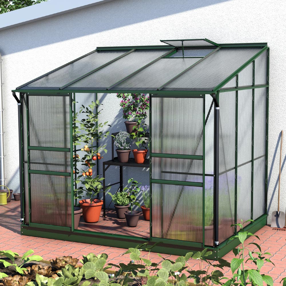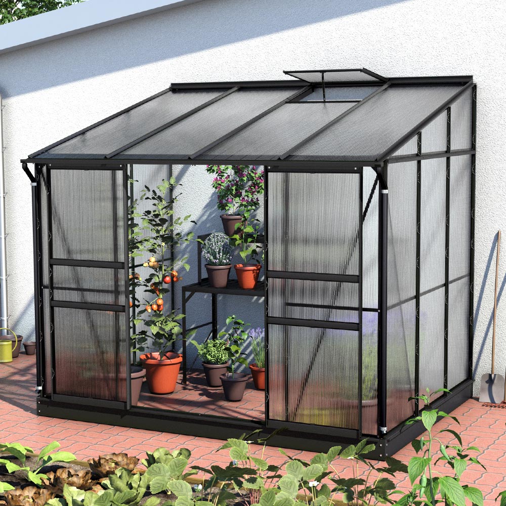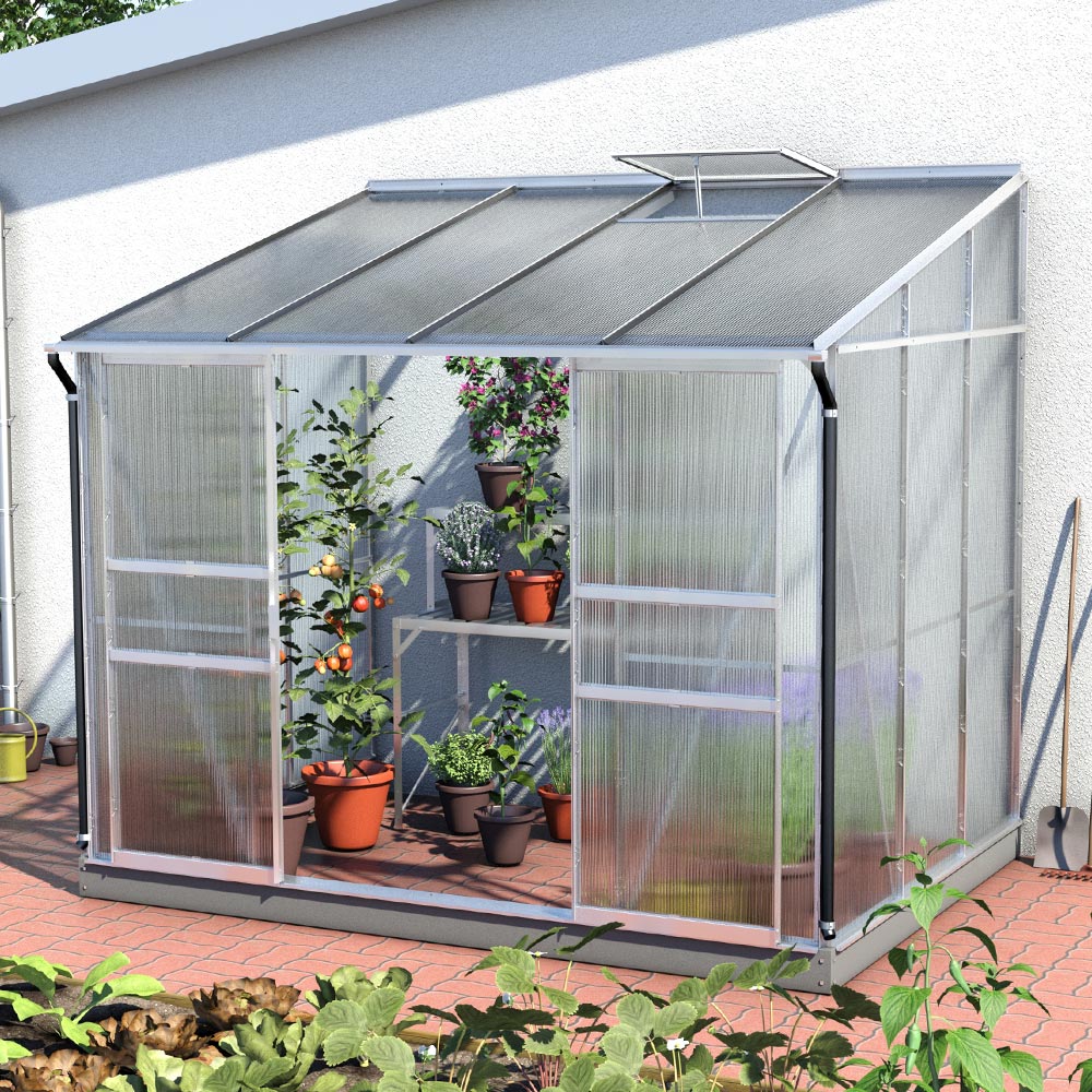 La structure en aluminium est robuste et facile d’entretien. Le vitrage propose trois options : plaques alvéolaires de 4mm, plaques alvéolaires de 6mm, ou vitrage combiné avec verre de sécurité (ESG) dans les parois latérales et plaques alvéolaires en toiture. Vous pouvez ainsi choisir entre une luminosité maximale ou une isolation renforcée. La double porte coulissante en façade offre un accès large et peu encombrant, ou peut être montée en porte simple de chaque côté. Un ouvrant de toit assure la ventilation.