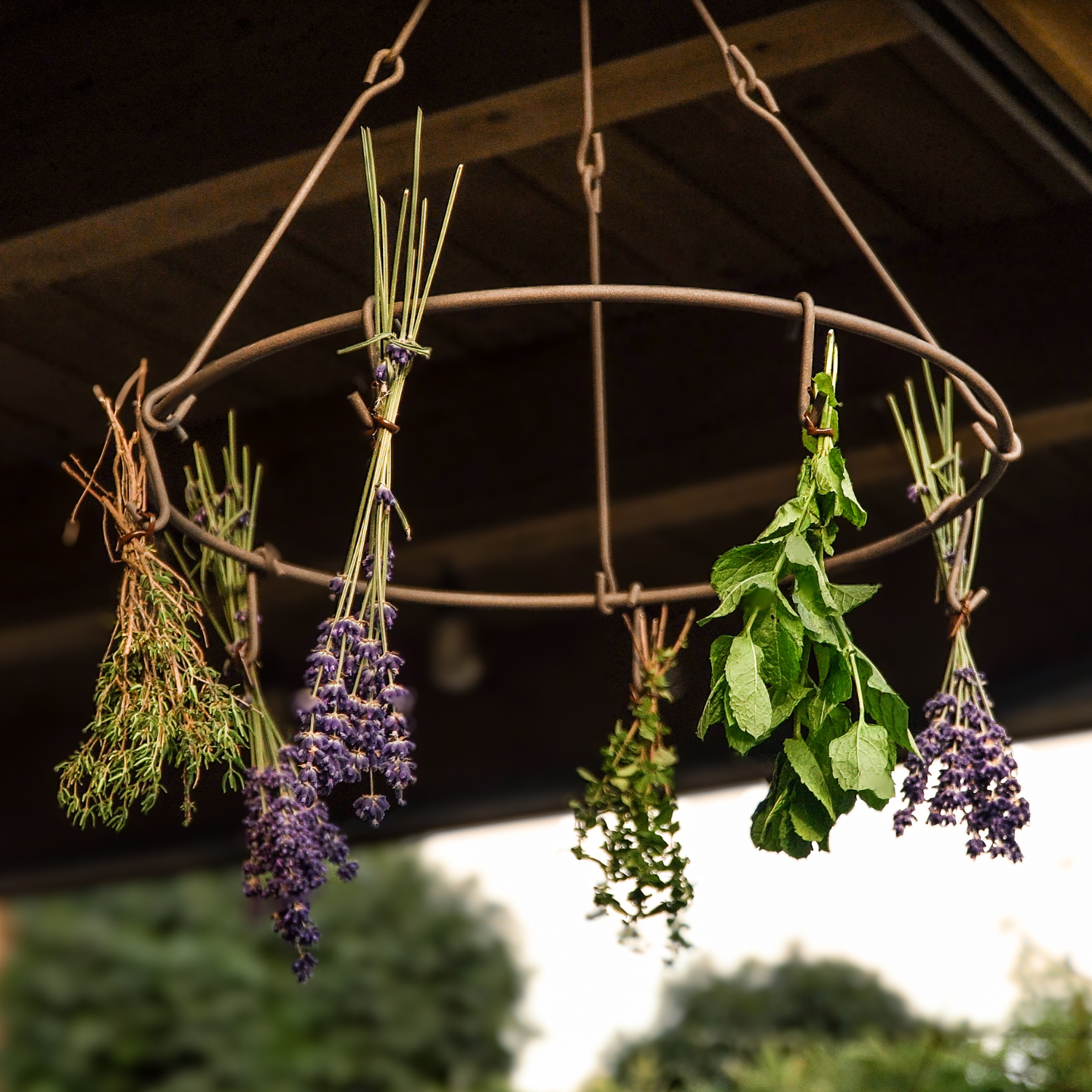Les herbes aromatiques sont délicieuses, et ne s’utilisent pas seulement fraîches. Attachez des herbes fraîches ensemble avec une ficelle et suspendez-les la tête en bas aux crochets de ce séchoir à herbes. Bien entendu, il en va de même pour les fleurs. Outre le fait que les herbes et les fleurs ont un aspect décoratif pendant le séchage, elles peuvent, une fois le séchage terminé, être utilisées en cuisine ou pour des bouquets.