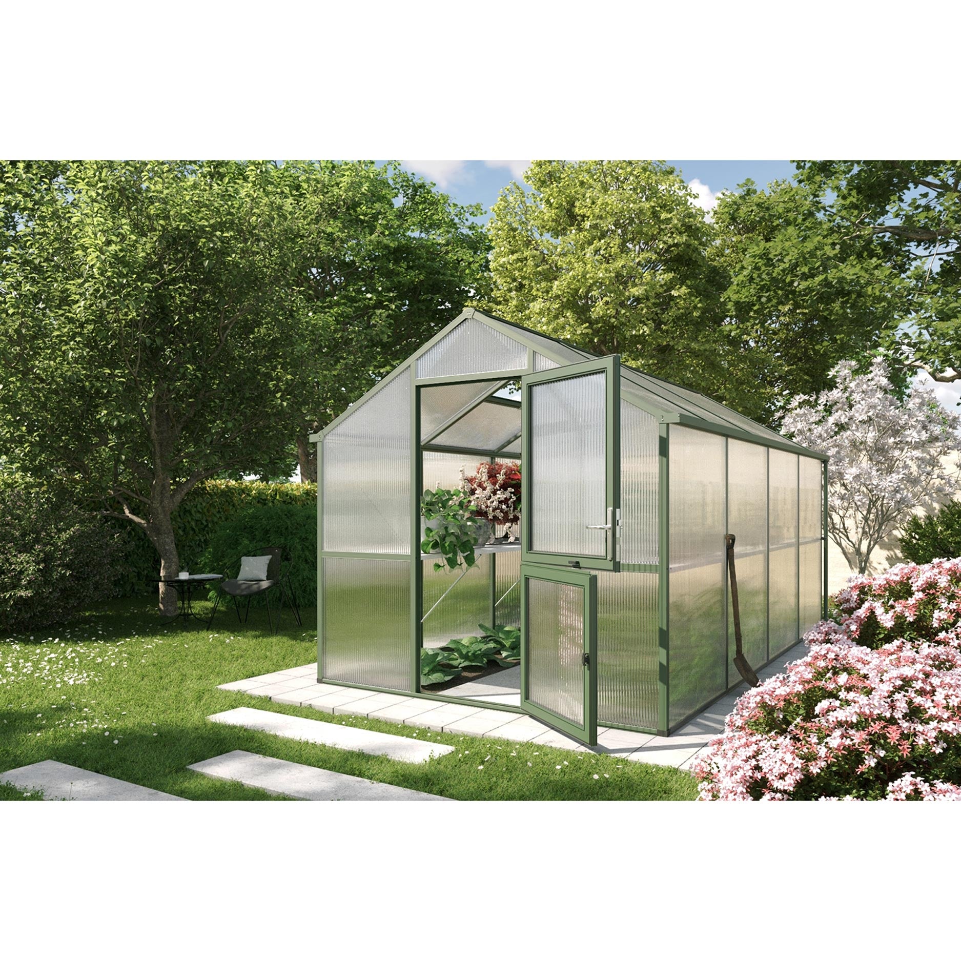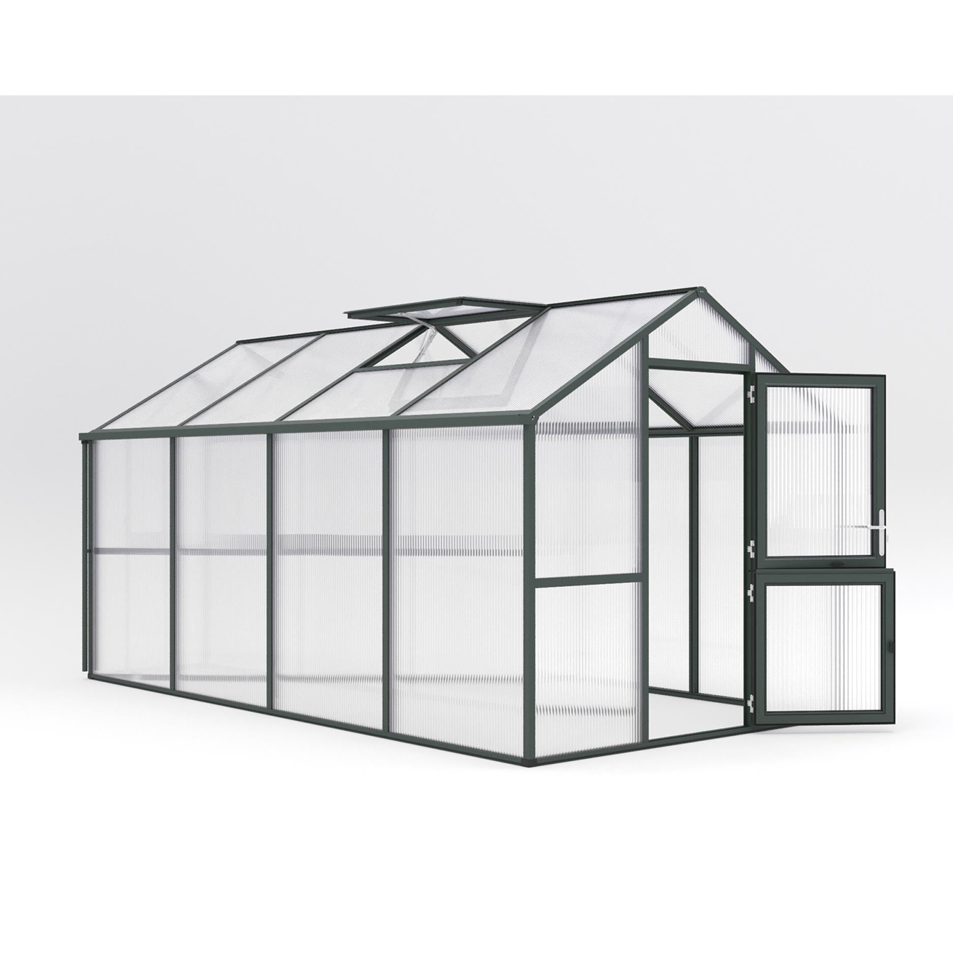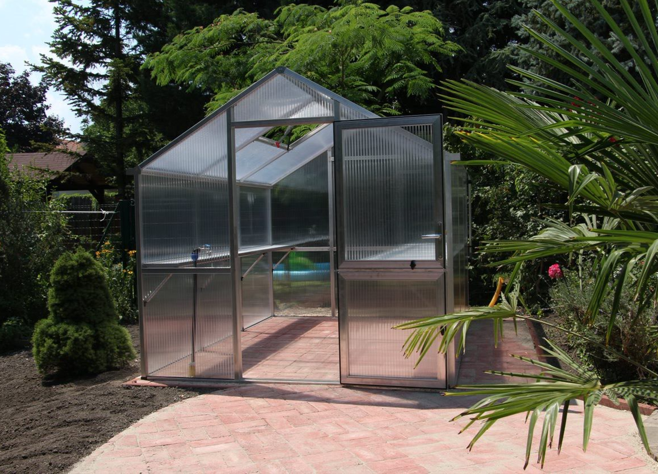 La structure repose sur un châssis en aluminium robuste avec des panneaux alvéolaires de 16mm, qui offrent la meilleure valeur d’isolation de la gamme KGT. Les panneaux sont protégés contre les UV, laissent passer une lumière diffuse et sont pratiquement incassables. L’Iris IV est équipée d’une large porte battante, d’une lucarne de toit automatique, d’une fenêtre arrière manuelle et de doubles gouttières pour l’évacuation de l’eau ou la récupération de l’eau de pluie. Avec le châssis de fondation en option, cette serre reste parfaitement stable, même en cas de vent fort et de charge prolongée.