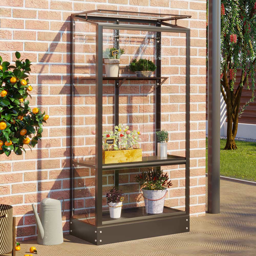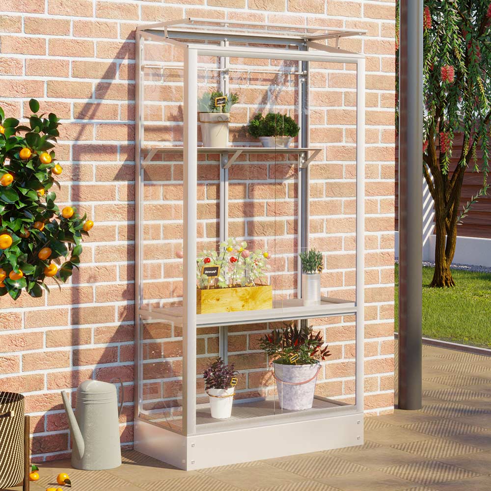La Polis 350 est une serre de culture très luxueuse pour le balcon ou la terrasse. La serre de culture se compose d’un cadre en aluminium avec des panneaux alvéolaires. Le meuble se compose de deux compartiments (en bas et en haut). Les deux parties peuvent être ouvertes et fermées individuellement.