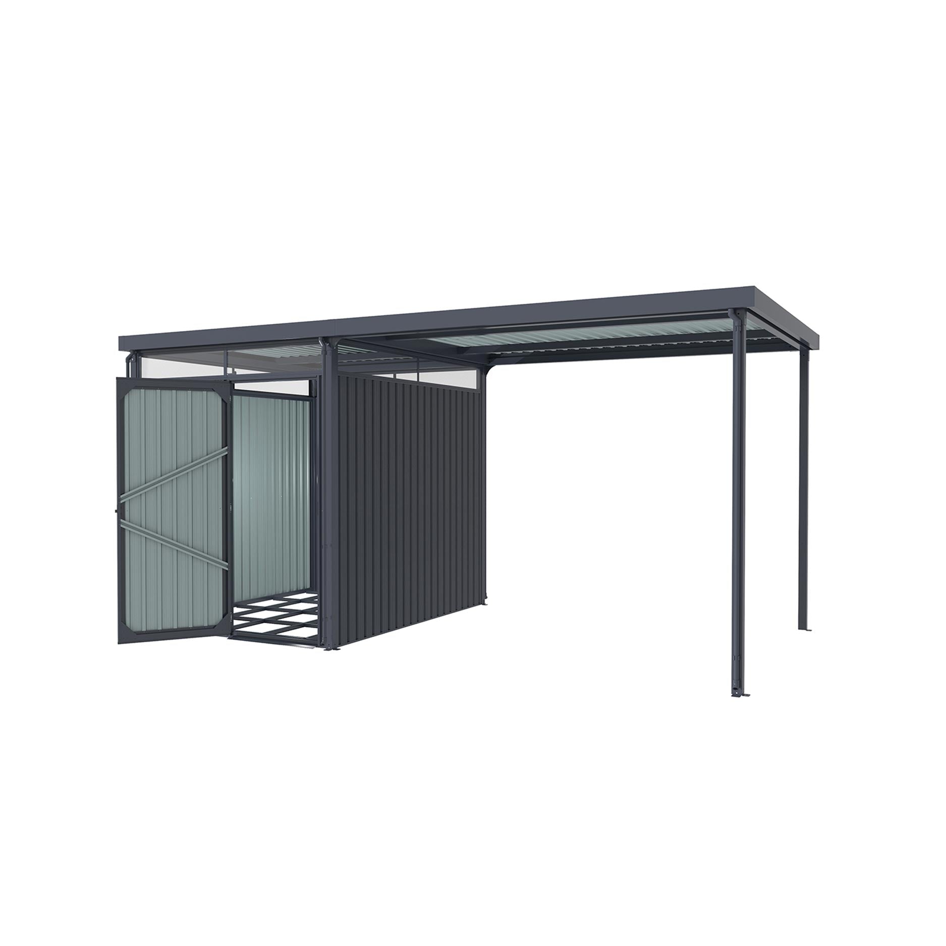 Le Rheinfelden existe en deux tailles. Le Rheinfelden 78 a une surface au sol de 4,42m2, tandis que le Rheinfelden 108 a une surface au sol de 6,43m2. Les deux abris offrent la possibilité d’extension. Le module d’extension Toit vous apporte encore 6,63m2 de surface. Le Rheinfelden 78 a une porte battante simple, le Rheinfelden 108 a une double porte battante.