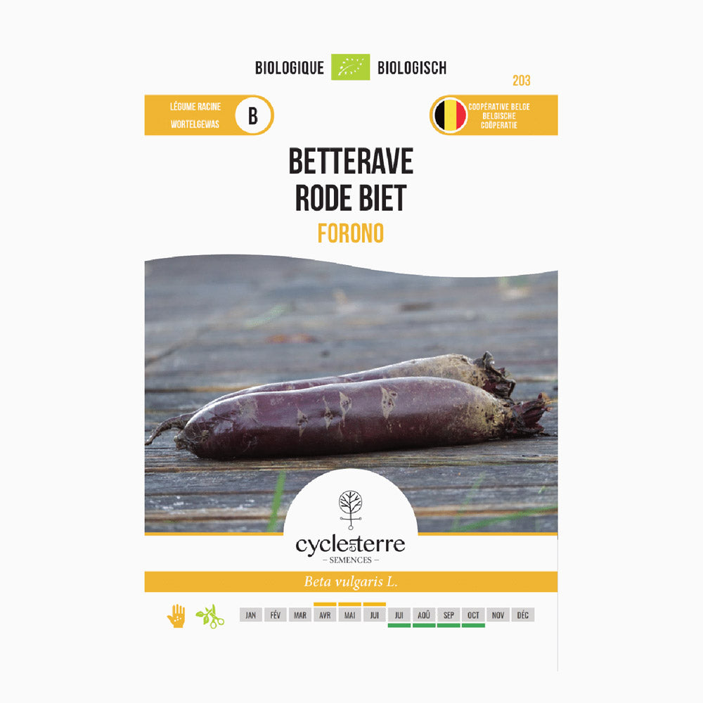 La betterave rouge Forono est une variété particulière qui se distingue par ses racines allongées, rouge foncé, et sa forme régulière. Cette variété tardive est connue pour sa saveur exceptionnelle, à la fois douce et intense. Grâce à sa forme compacte, Forono est idéale pour obtenir des tranches régulières, parfaites pour des applications culinaires créatives.