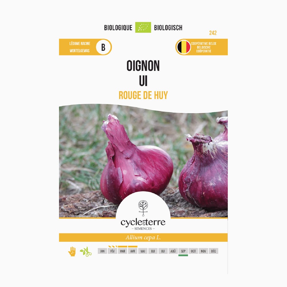 L’oignon rouge « De Huy » est une variété régionale, reconnue pour son bulbe rouge caractéristique, légèrement aplati, pouvant atteindre un diamètre impressionnant de 12 cm. Cet oignon offre une saveur riche et une excellente conservation, ce qui le rend idéal aussi bien pour une utilisation fraîche que pour un stockage longue durée.