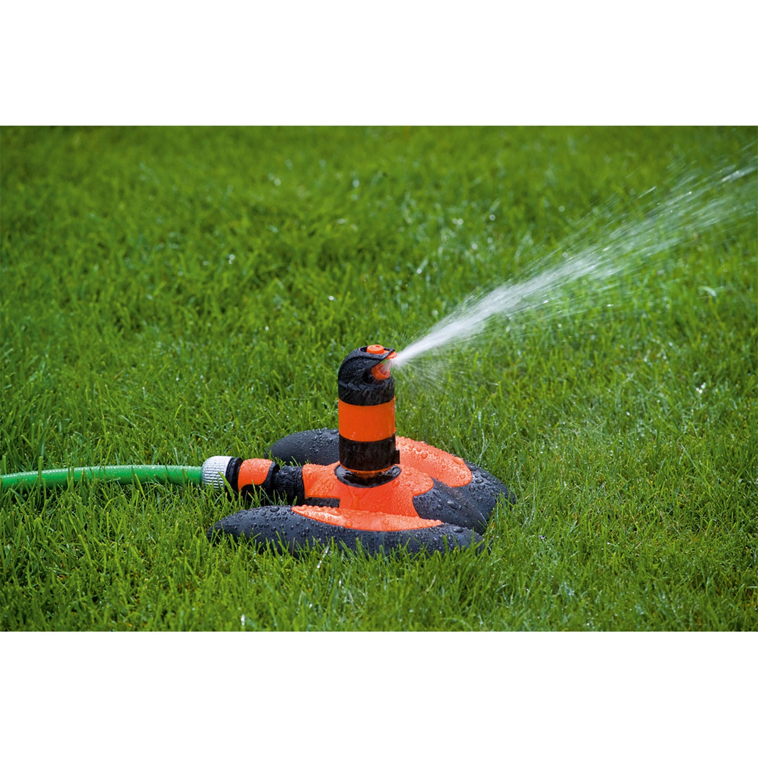 Un arroseur haut de gamme sur un socle stable en plastique pour l’arrosage des massifs et des jardins de devant.